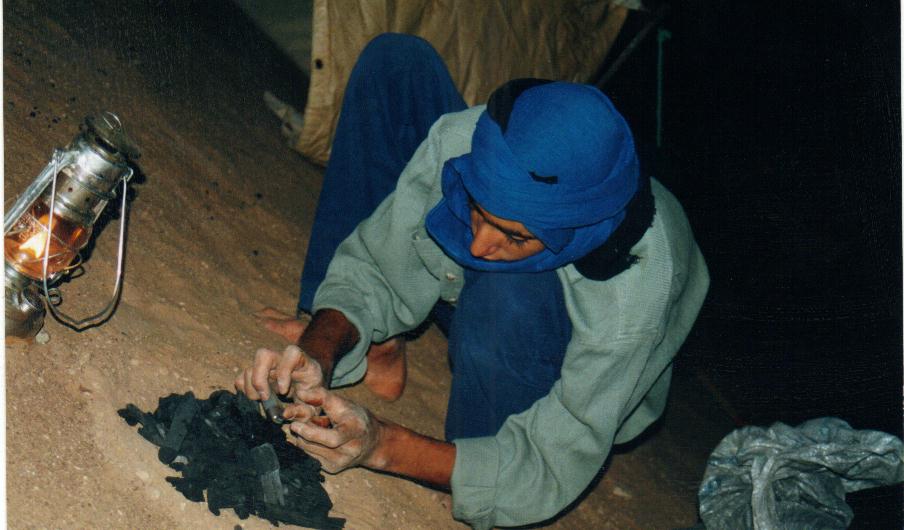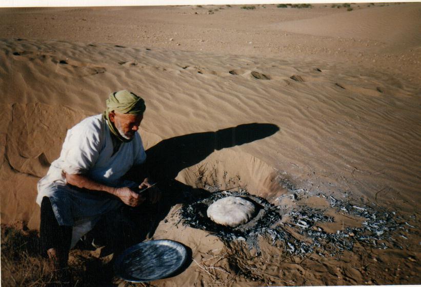 Der Hefeteig wird mit einem brennenden Palmwedel etwas angebacken damit der Sand nicht anklebt |